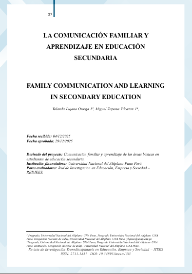 Lujano Ortega, Y., & Zapana Vilcazan, M. (2026). III. LA COMUNICACIÓN FAMILIAR Y APRENDIZAJE EN EDUCACIÓN SECUNDARIA. Revista De Investigación Transdisciplinaria En Educación, Empresa Y Sociedad - ITEES, 13(3). https://doi.org/10.34893/itees.v13i3.595